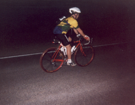 by the intermittent mating of cleat and pedal. One by one, flashing tailbeacons began